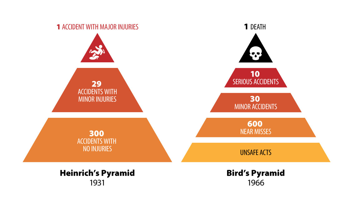 Herbert William Heinrich was an assistant superintendent of an insurance company and back in 1931 he commenced a study of more than 75,000 industrial accidents. The result of this work was published in Industrial Accident Prevention: A Scientific Approach. Heinrich’s resultant theory is often depicted in a pyramid or a triangle. It is based upon the need to eliminate non-injury incidents in order to eliminate minor and serious injuries. By focusing on preventing the 300 incidents that occur for every serious injury we could reach the goal of injury elimination.